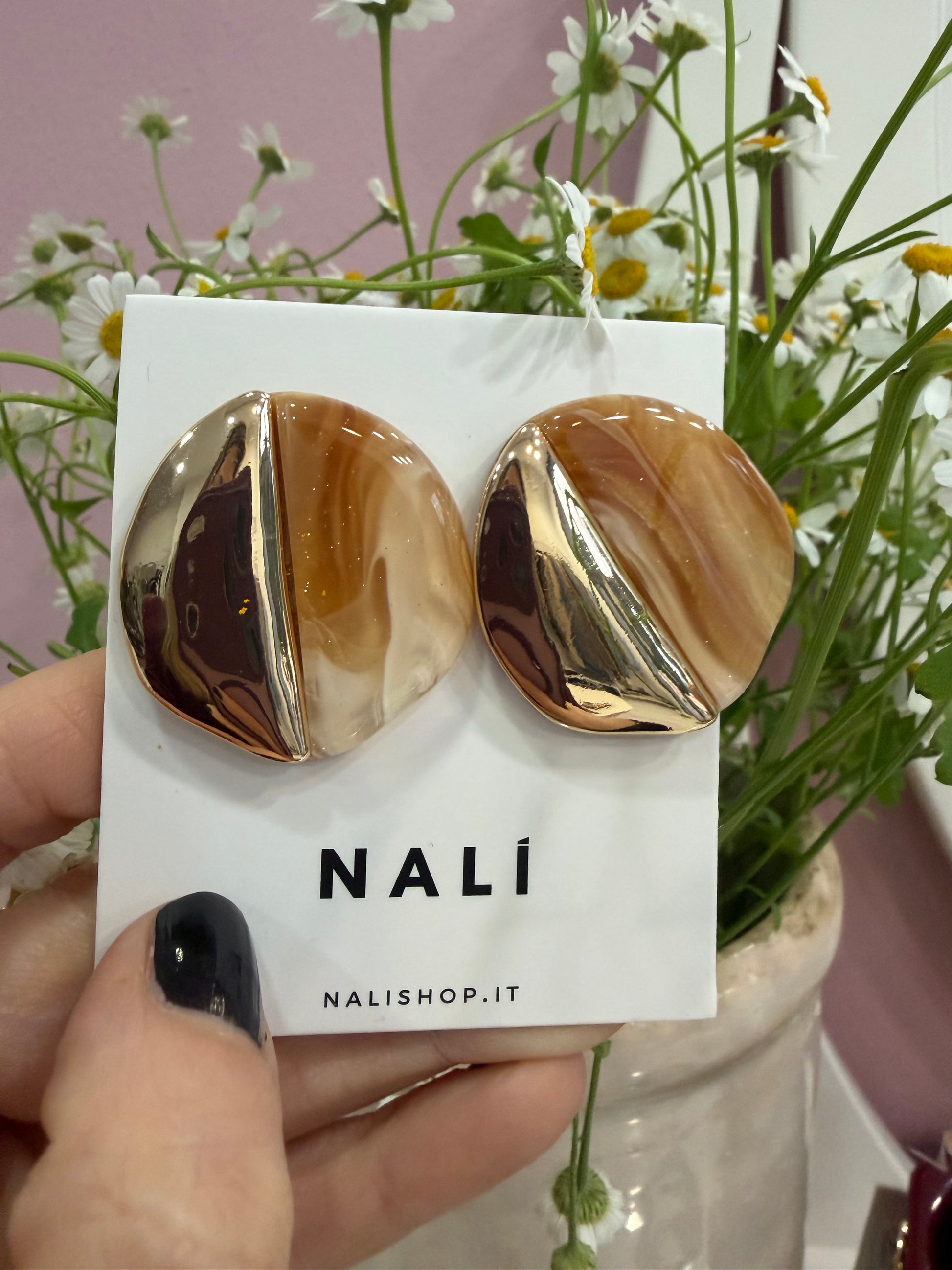 Realizzati in resina nelle tonalità oro e beige, questi orecchini combinano calore e raffinatezza in un design leggero ma d’impatto. Le nuance neutre li rendono estremamente versatili, ideali sia per completare outfit quotidiani che per impreziosire look più sofisticati.